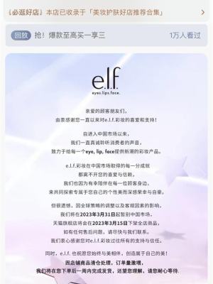 然而2月23日,现代快报记者了解到,elf已在电商平台旗舰店和短视频官方网络账号上发布公告,表示将在2023年3月31日起暂别中国市场,旗舰店将会在2023年3月15日下架全店商品。消费者如有elf任何售后问题,请尽快联系客服。该品牌此次做出退出中国的决定be,是“因全球策略的调整以及客观因素的影响”。截至2月23日,该品牌旗舰店的粉丝数为48.5万人。