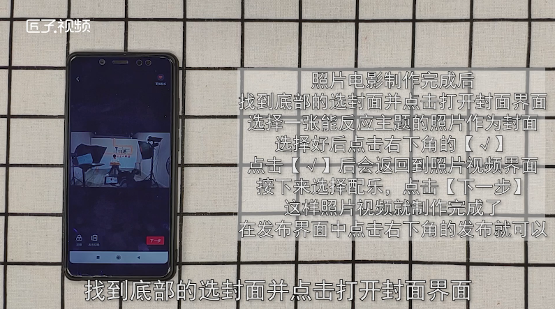 6、点击【√】后会返回到照片视频界面,接下来选择配乐,点击【下一步】。