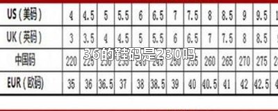 - 36的鞋码是230吗 36的鞋码是230,即23厘米,36码是欧码,230码是国际码。鞋码,也称鞋号,是用来衡量人类脚的形状以便配鞋的标准单位,不同人群和不同用途的鞋,鞋码有所不同。 36的...