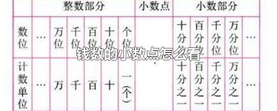 - 钱数的小数点怎么看 钱数的小数点看的时候先看小数点左右两位,左边第一位为个位,单位为元,右边第一位为十分位,单位为角,看整数时只需看小数点左边,左边采用的是三位分节...