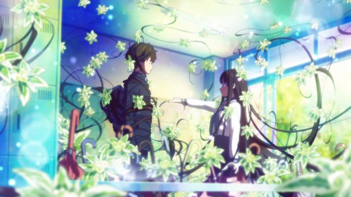 《冰菓》虽然披着“推理”的外衣,但是实际上是一部校园恋爱动画。该作在场景塑造和人物刻画上可以说是赏心悦目。原本就十分丰满的人设,再加上恰到好处的场景,给人一种重回校园生活的感觉。与此同时,千反田爱瑠和折木奉太郎之间的恋爱心理也在这些细致的刻画手法中得到了最好的展现。