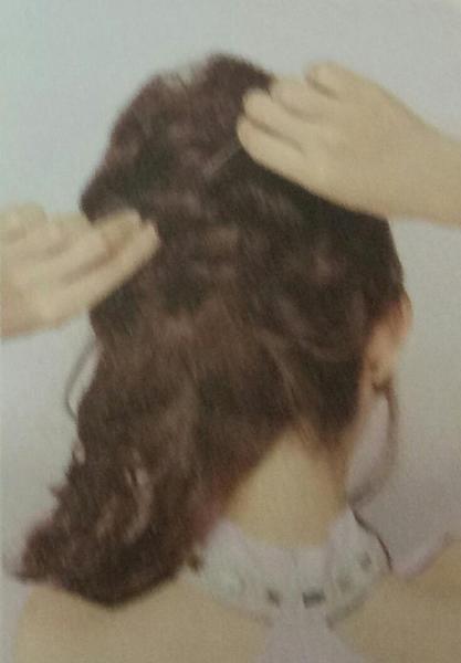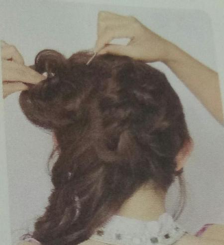 如此反复多次,直到后脑勺显得饱满为止,再轻轻拉一下盘发发丝,使之更蓬松饱满些。