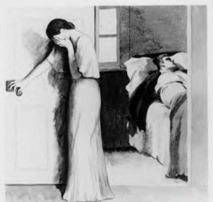 B:忧虑,丈夫酒醉在床上;