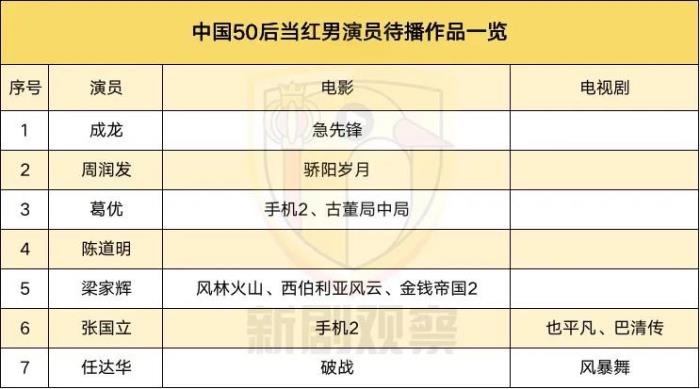 为了更好地观测国内演员生态,新剧观察(ID:xinjuguancha)通过全方位的搜罗资料及调研,整理了国内150多位当红男演员的库存情况,主要针对电影和剧集两方面,并且按照年龄分为50后、60后、70后、80后、90后三部分,排列顺序不分地位先后。从此可以看出,实力派老前辈们几乎将重心放置在电影方面居多,而80后男演员则剧影两不误,90后年轻代男演员由于经验不足等原因较多地接拍一些剧集项目。经过记者细心地整理,中国男演员库存情况一目了然,也方便各平台公司及资方做好招募演员、购买项目等准备。