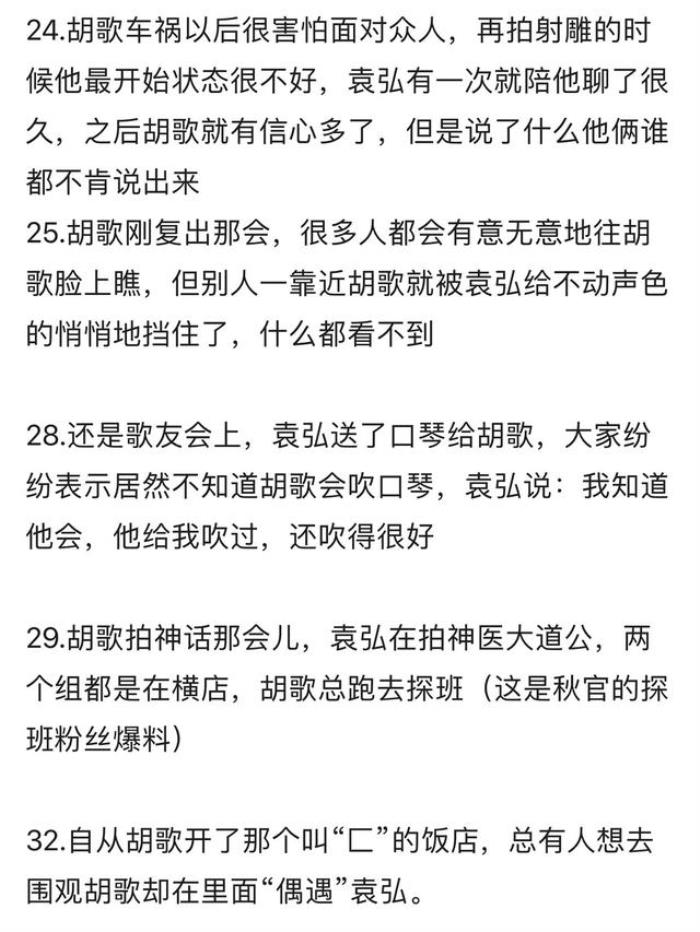 在胡歌当年出车祸之前,袁弘似乎预感到了不对,便一遍遍对胡歌说路上要小心。胡歌出事以后,袁弘还在片场,没人敢告诉他胡歌出事了。当所有工作人员都不接袁弘电话时,他就急了,戏也不拍了就要知道胡歌怎么了。在得知真相后,袁弘一个人蹲在横店的湖边,一遍遍说“怎么可能怎么可能”。
