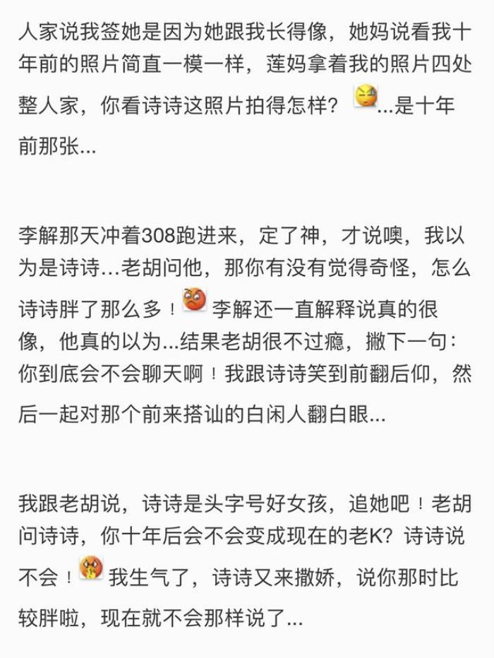 12年前,经纪人蔡艺侬在博客中写道与胡歌刘诗诗等的签约过程。蔡艺侬说人人都说刘诗诗跟她长得像所以才签了诗诗,于是蔡艺侬便对胡歌说:“诗诗是头字号女孩,追她吧!”不过,胡歌开玩笑地问诗诗十年后会不会变成蔡艺侬,以此就打马虎眼过去了。