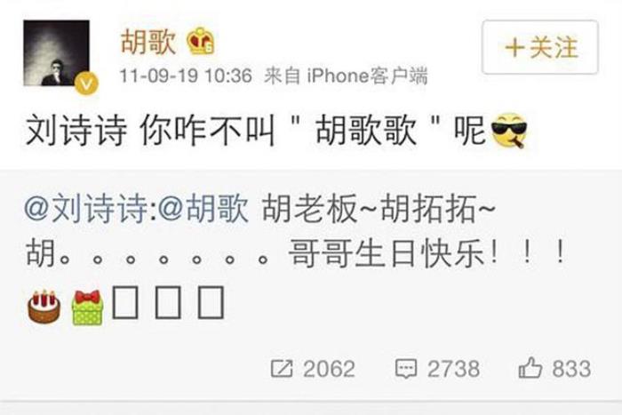 在刘诗诗结婚之前,俩人在公众平台的互动非常频繁,胡歌每一年都会为刘诗诗庆生,直到诗诗结婚后胡歌就开始避嫌了。而在刘诗诗与吴奇隆结婚的那天,热搜第一竟然是胡歌,这背后代表了无数歌诗党的无奈。
