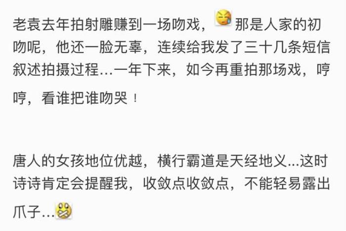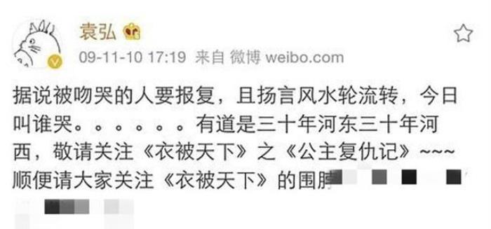 事后袁弘形容刘诗诗是纯粹得像白纸一样的女孩儿,还发文称被吻哭的女孩要报复。连蔡艺侬都在早年博客中吐槽袁弘,说他当时连发了三十几条短信叙述把诗诗吻哭的那场戏。
