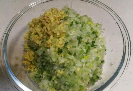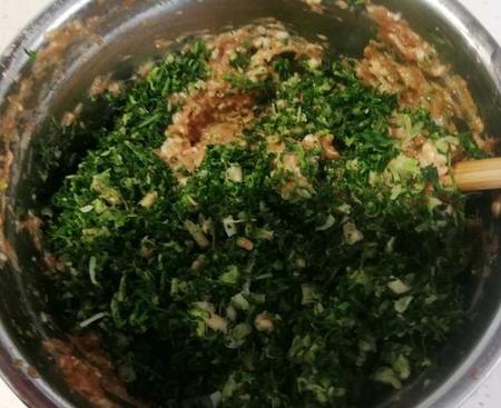 放入葱姜末搅打均匀,放入切好的芹菜,拌匀馅就拌好了。