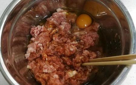 猪肉自己剁,干净口感好。倒入生抽 食用油,打入一个鸡蛋,一点清水打馅,先搅拌均匀,筷子顺着一个方向搅打,让它上筋,10分钟左右