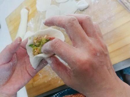 接下来把醒发好的面团擀成皮,开始包饺子咯。