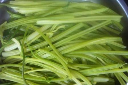 烧一锅水,把芹菜放进去锅开煮2-3分钟,煮的时候可以放点盐和油,芹菜可以保持绿色。
