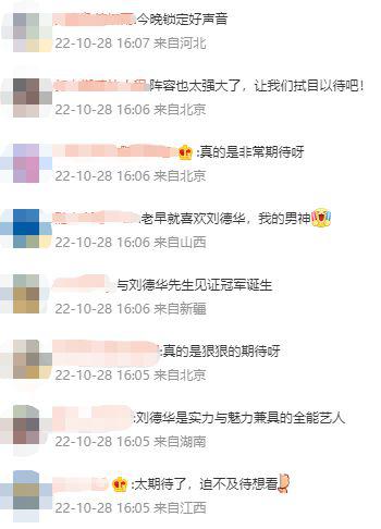 今晚刘德华本人将到《中国好声音》现场的消息一出,网友们的期待之情溢满了屏幕," 狠狠期待 "," 迫不及待想看 "," 今晚锁定好声音 "," 与刘德华见证冠军诞生 "。