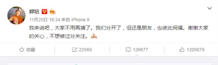 然而,好戏不长,两人还是分手了,郑恺在微博宣布:我来说吧,大家不用再猜了。我们分开了,但还是朋友,也彼此祝福。谢谢大家的关心,不想被过分关注。