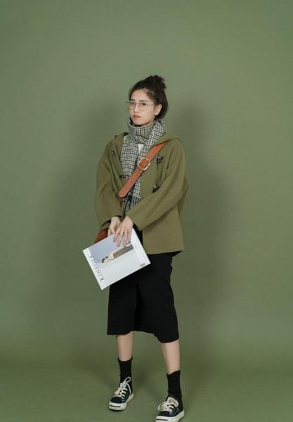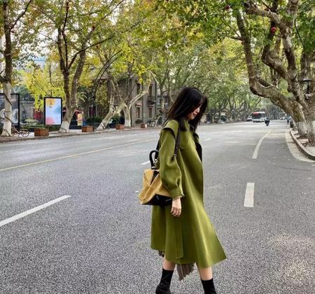如果是小个子的女生,觉得长款太压身高,可以考虑短款绿色大衣,搭配一个毛线半身裙,时尚又保暖,还超级显高。