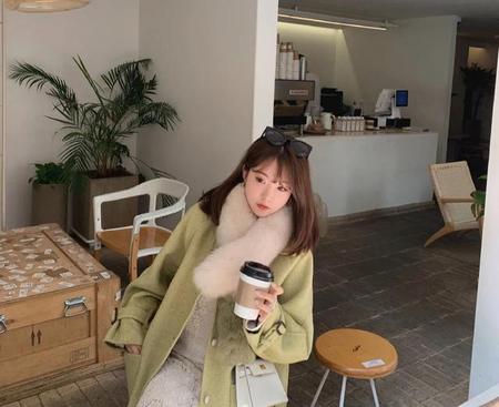 浅绿色超级少女的颜色,很显皮肤白,再搭配一个毛绒绒的小围巾,可爱和温暖并存,太好看了。