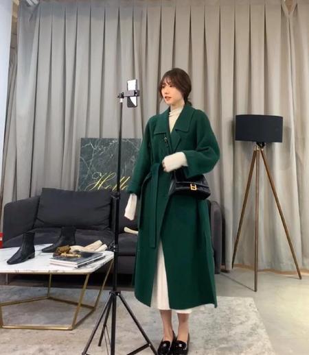 或者搭配浅绿色不同质感的内搭,比如浅色针织修身连衣裙,长度尽量不要超过大衣,都是可以的…