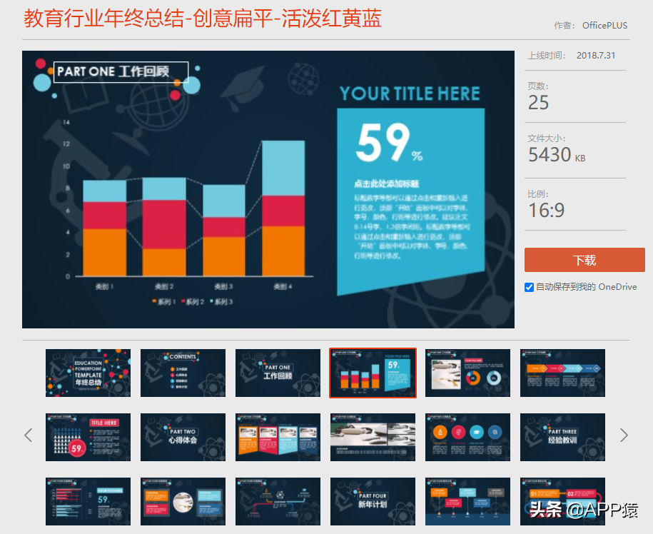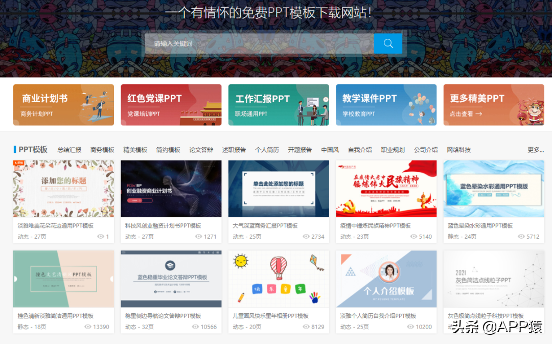 【优品PPT】是一个做得比较久的PPT模板下载站点了,素材的数量很多,目前也仍在更新。不过有的比较年代久远的模板可能跟不上现在的审美高度,所以需要自己挑选一下。另外有个值得注意的地方,这个站点有一些入口是跳转到其它站点的,属于推广内容,你只要下载属于【优品PPT】这个站本身的素材就好。
