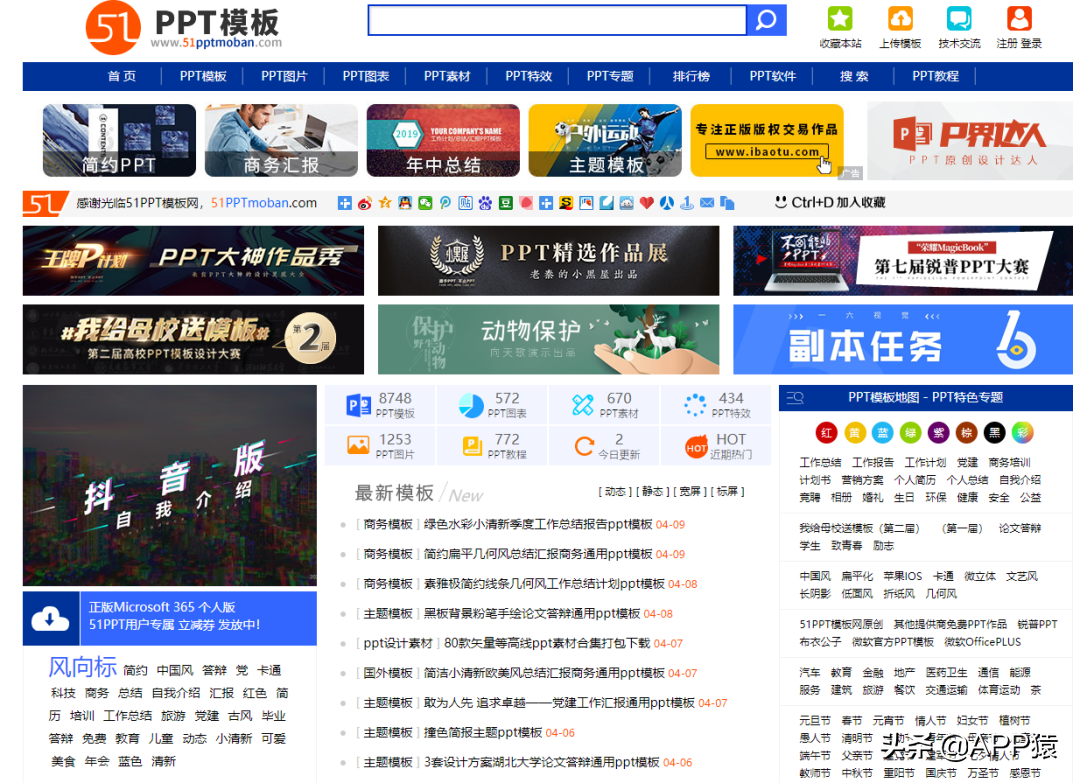 【51PPT】的特点是更新模板的频率比较高,基本上每天都有新的模板更新,分类也齐全。缺点是里面的推广内容稍微多一些,需要注意识别,只下载它本站的免费PPT模板即可。
