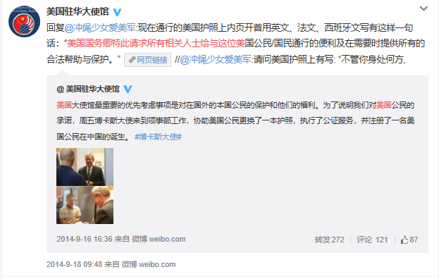可见关于中国方面的描述与传言是不相符合的。虽然小编没有找到美国护照,但是找到了美国驻华大使馆的辟谣信息。