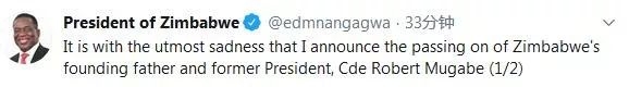 津巴布韦总统姆南加古瓦称:“我怀着极其悲伤的心情宣布,津巴布韦开国元勋、前总统罗伯特·穆加贝去世”。