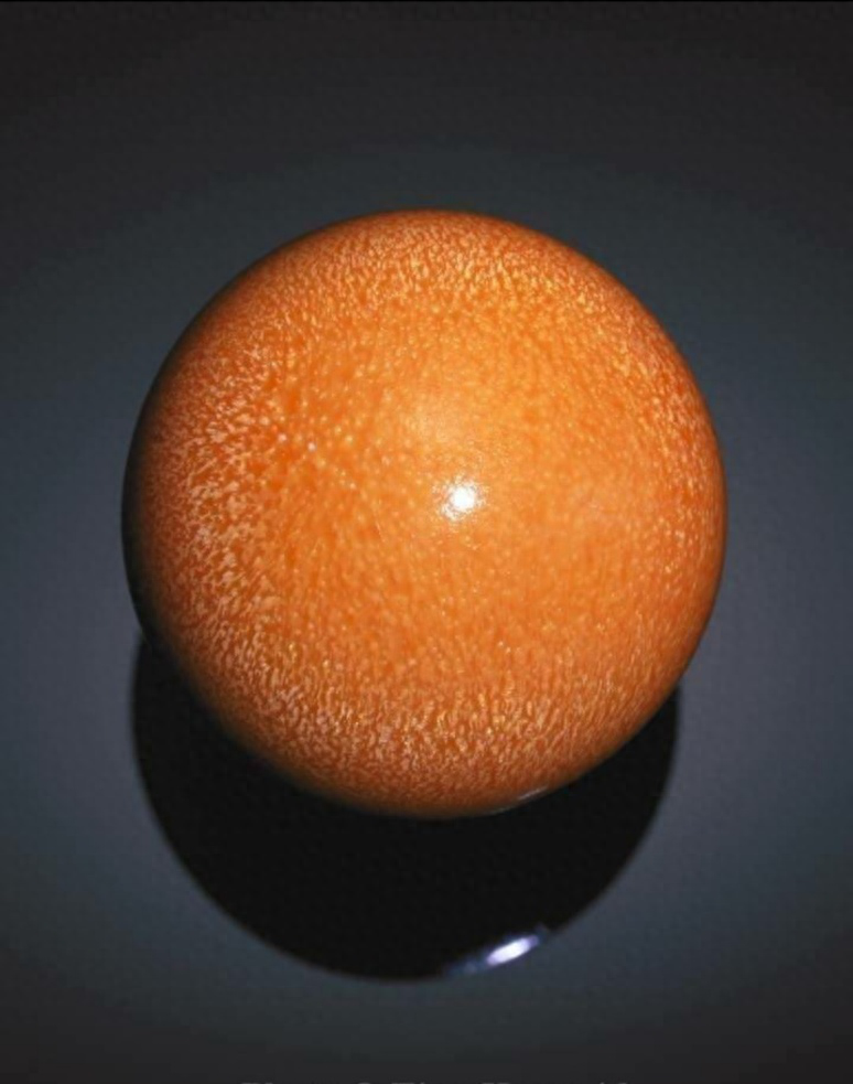 美乐珠的颜色一般有橘红、橘黄、黄、黄褐,到近白色,在收藏市场上,美乐珠以类似于成熟木瓜的橙色调最为珍贵。品质优良的美乐珠内部具有如云似焰的火焰纹路构造,外观则呈现晶莹的瓷状光泽。目前,美乐珠在全球的存量极少,据说主要来自越南最后王朝阮朝的皇室宝藏。