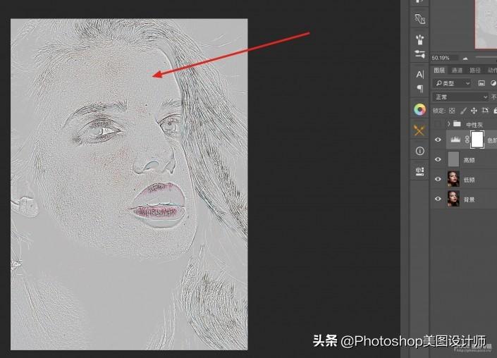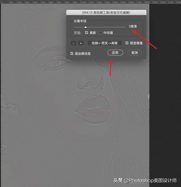 1.将画面中皮肤上的纹理层从皮肤上提取出来,作为高频层。