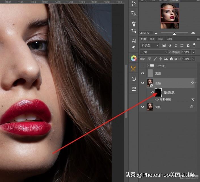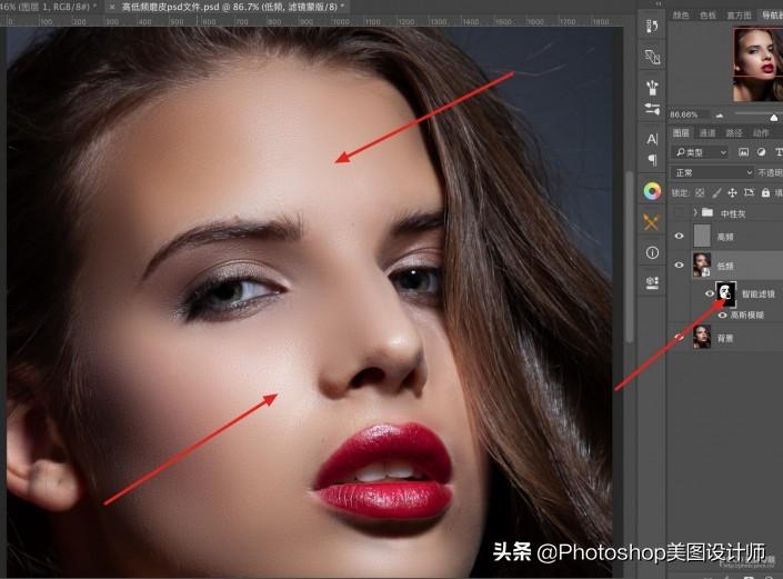 4.对低频层处理的方法和手动高低频一样,转换智能对象-执行-模糊-高斯模糊-设置数值-对图层反相蒙版,用白色画笔涂抹需要磨皮的地方。
