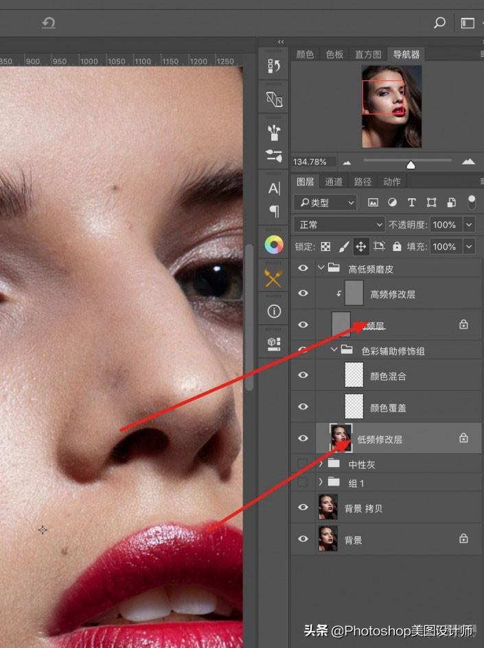 高低频磨皮,顾名思义就是有两个操作图层,将皮肤分成两层。