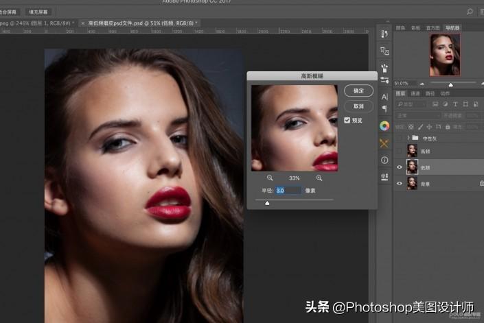 3.将高频层小眼睛关闭,然后会到低频层,执行滤镜-模糊-高斯模糊-设置半径为3或者3的倍数。