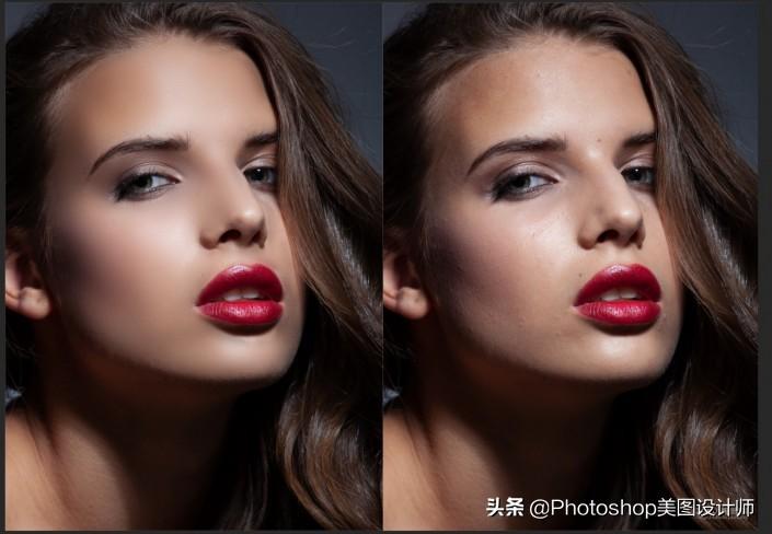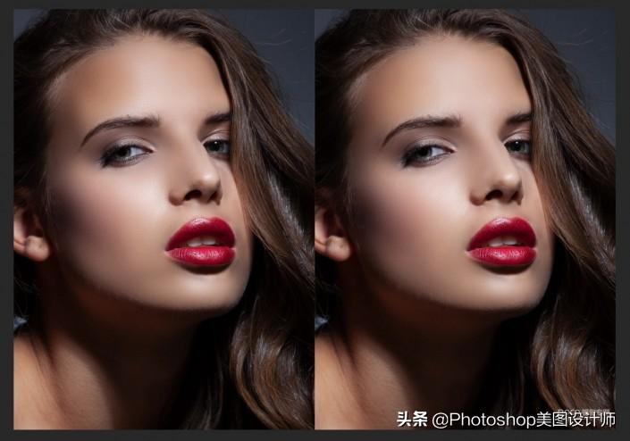 10.左图为处理后,右图为处理右,现在前后的对比已经发生来一个很大的变化,这就是我们完全手动来操作高低频磨皮,接下来再和大家介绍用插件来制作高低频磨皮。