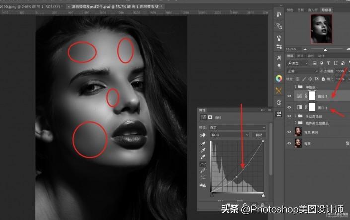 6.先建立一个黑白调整层然后建立一个曲线调整层并将曲线拉低,使图片变暗,这样我们就会发现,皮肤上的光影结构就不是特别好,像图中画圈的部分