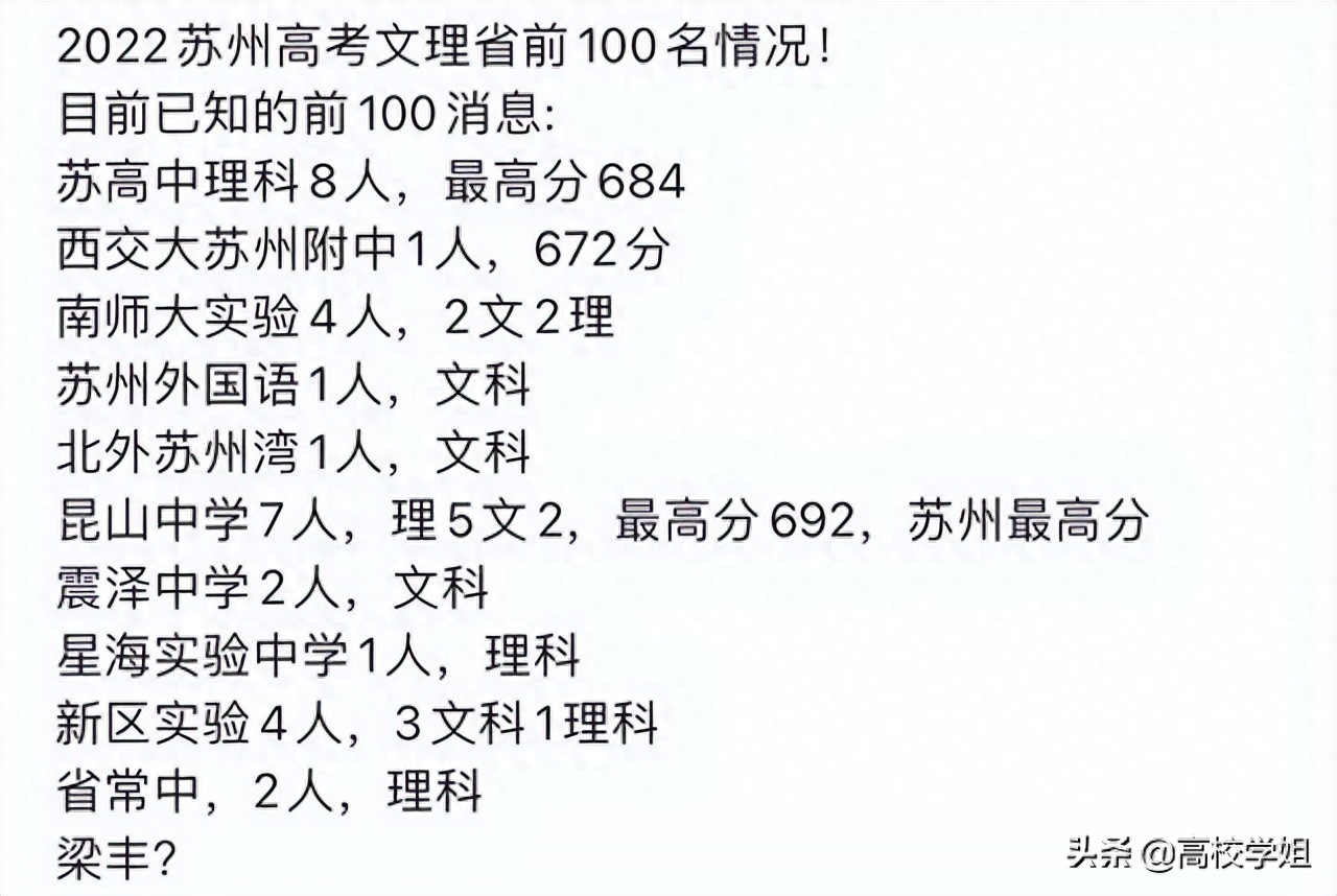 苏州今年虽然受疫情影响停课,但是从高分表现来说非常好,理科前十至少2人,昆山近些年崛起了;根据苏州某老师的统计数据,今年苏州文理科全省前100名已经达到了31人(不含梁丰高中),文理前100名比例至少达到了14.9%,如果结果属实,那么苏州今年高考成绩还是非常优秀的,丝毫没有收到疫情的影响。