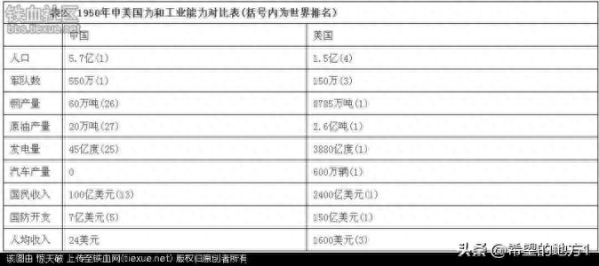 抗美援朝战争爆发时,以美国为代表的"联合国军"(当然是非法的),在和中朝实力对比上占有绝对压倒性优势。本文就单单拿作为联合国军一员的美国和中国的综合国力来做一下对比。