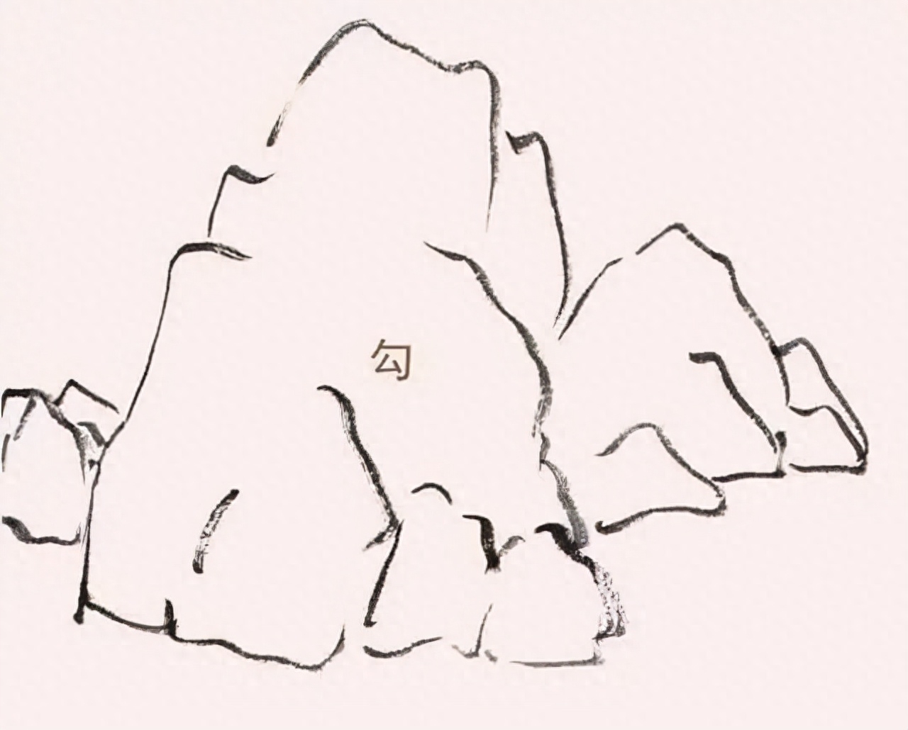 勾:是用中峰或侧峰画石块的轮廓,确定其形状,勾石的顺序是先左后右,小的石块可由两笔勾成,大的石块可由三笔或三笔以上。