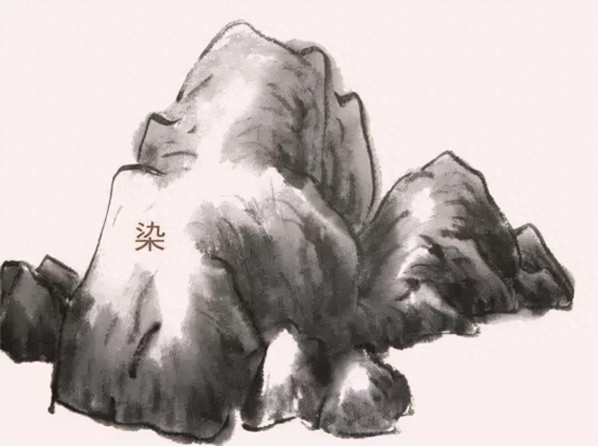染:是以淡墨大笔湿画石之暗面,依据原有的明暗加以渲染,使造型显出立体感,调节石与石之间的空间感。在皴擦间用淡墨渲染暗部,要多蘸水。