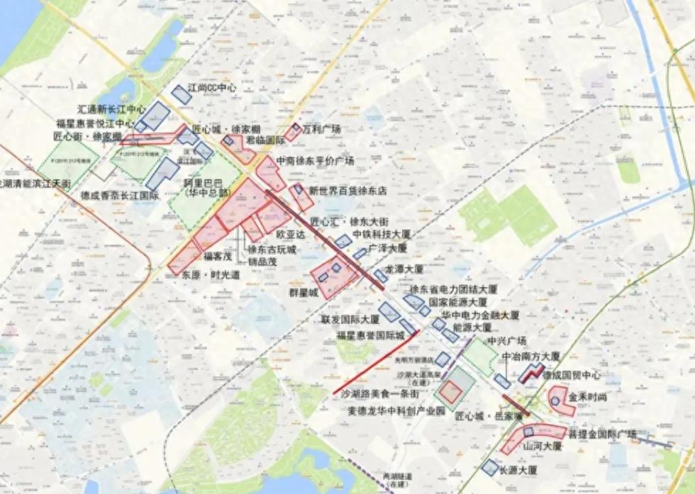 销品茂、徐东平价、新世界、群星城,徐东至汪家墩地铁商业体,“徐东古玩城”,欧亚达、居然之家,麦德龙大卖场、还有华中电力大厦、三峡电力大厦、湖北能源大厦,光明万丽五星酒店。正在建设的阿里巴巴武汉总部让徐东更加耀眼。