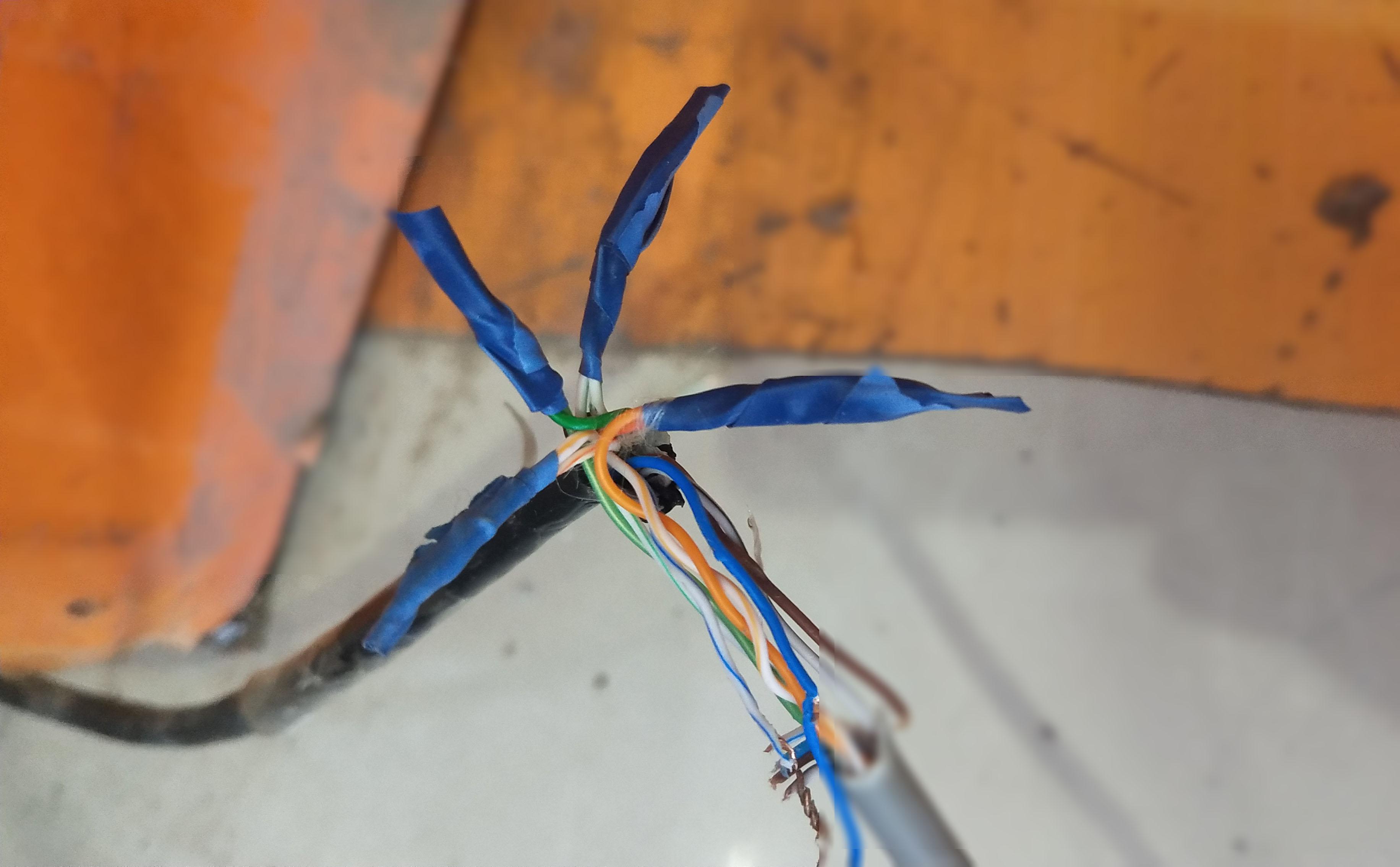 大家看吧,墙角的这根网线呢,已经被老鼠光顾过了,这就是最好的见证,每次遇到这种情况,大家都很头疼,再重新拉一根吧,网线不值钱,还是网线都是钉在线槽里,线槽又压在柜子下面,哎,反正就是太麻烦了,所以我宁原接一下,也不愿意去拉一根线了。都成这样子了,那怎么接法呢?