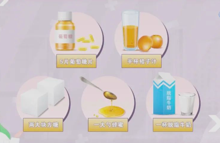 当出现低血糖反应时,先及时检测血糖,吃15-20克葡萄糖或其他无脂碳水化合物;等15分钟,再吃15-20克葡萄糖或其他无脂碳水化合物;如血糖值还没达到正常水平,再吃15-20克碳水化合物后,等15分钟监测血糖。