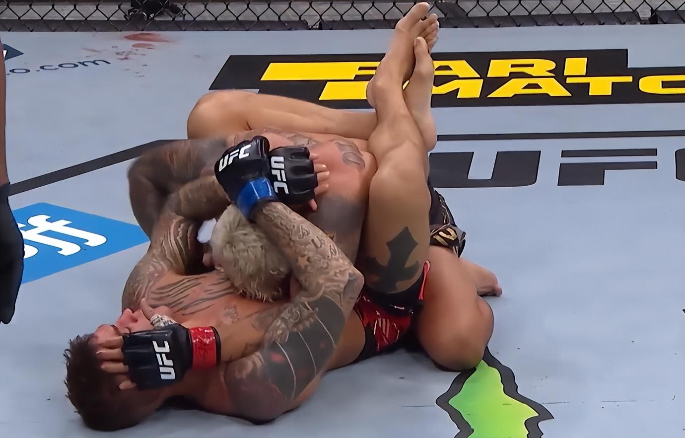 陷入地面后,奥利维拉开始展现出极强的技巧实力,一度锁死砖石哥,近乎2分钟的地面时间,奥利维拉占据了绝对优势,起身后的一记“致命低扫”更是将“砖石”打到了残血状态,估计这一局五回合是打不满了。