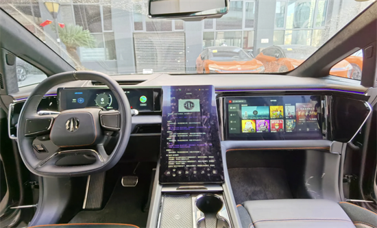 而在进入车内后,映入眼帘的是高合HiPhi X的三块大尺寸屏幕,虽然视觉效果上不如一体屏协调,但中央的超大尺寸竖状屏幕与副驾驶座的娱乐屏还是十分吸睛。总之,高合HiPhi X的这些“花活”也不能说除了拉风一无是处,用户还是有机会不弯腰地优雅入车的。