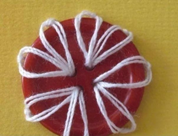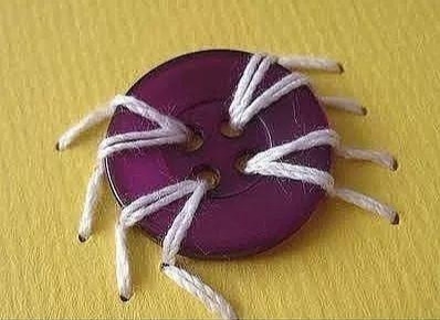 5.针线松松的在两孔与衣服之间进出3至4次,然后以同样方法进出另外两孔;