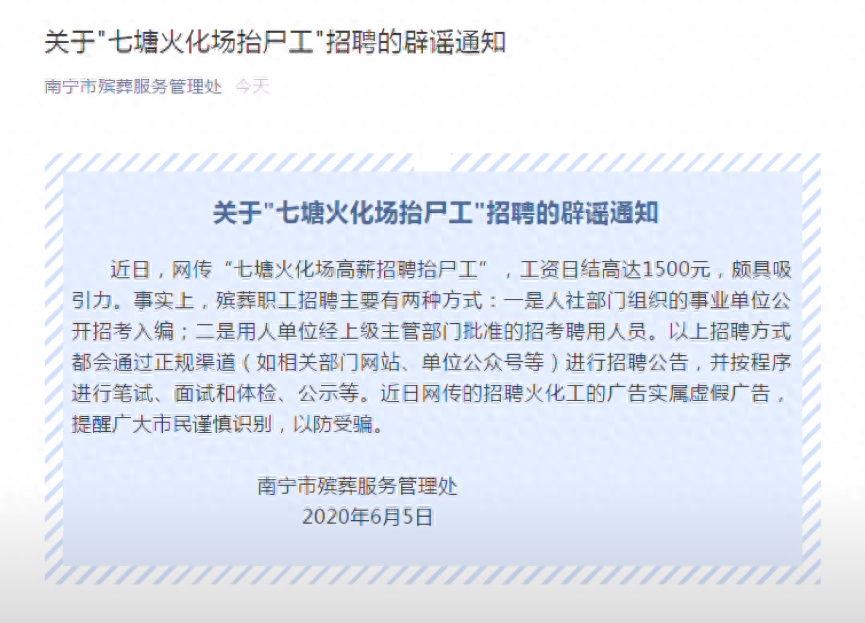 近日,一张《急招七塘镇火葬场抬尸工30人》的招聘宣传单在广西南宁人的朋友圈热传,因为单上的薪资待遇可是让人羡慕不已,但真有这样的好事吗?