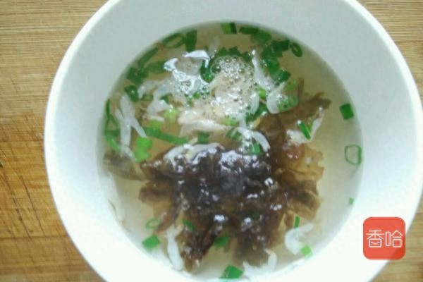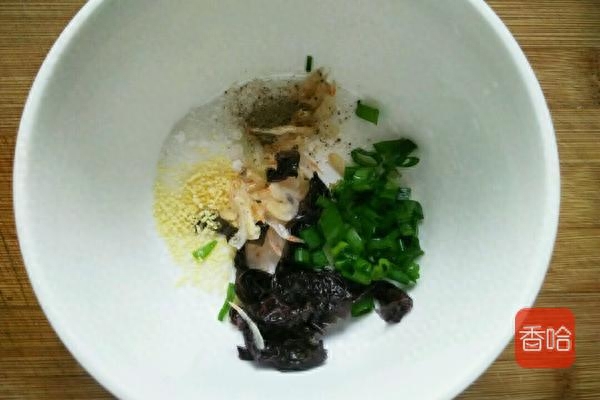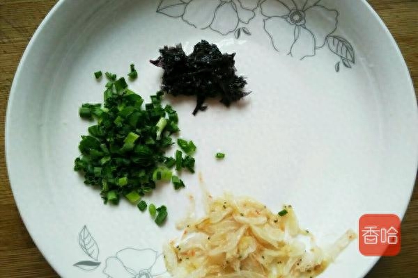 11.趁着煮饺子的时间,调好汤碗,(碗中放入盐,鸡精,葱花,胡椒粉和紫菜,虾皮)