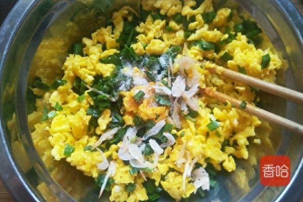 7.倒入韭菜碗中,放入虾皮,并调入盐,五香粉,搅拌均匀就可以包饺子了