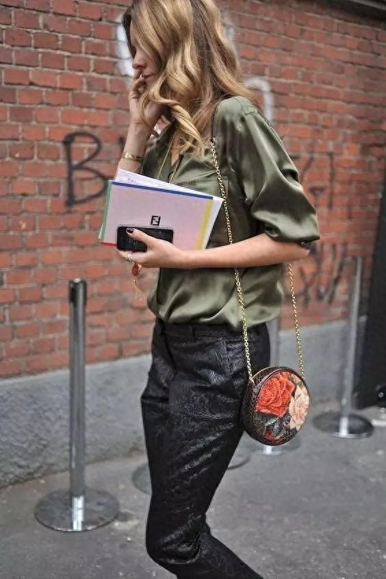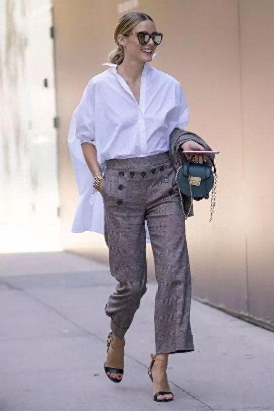 轻浮修身的短款上衣搭配高腰裤。太长上衣的衣摆全盘塞出来后,肚子处会显得痴肥