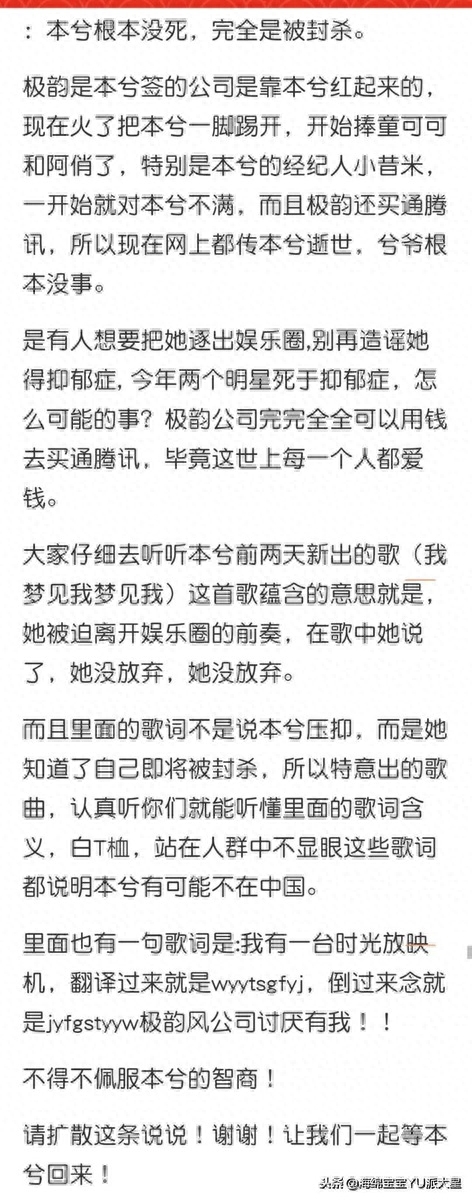 其实小编觉得本兮去世的消息应该是真的,而本兮微博突然发表动态,很有可能微博被盗,有人故意发了我没死的微博内容,制造一些大新闻。本兮已经去世了,也希望一些网友不要觉得到了本兮的微博发个内容是很好玩的事,还是希望大家能够尊重死者。
