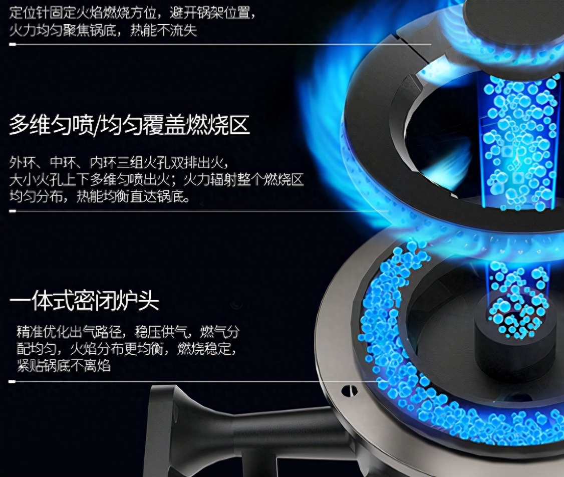 另外,该燃气灶是一个一体式密闭炉头,可精准优化出气路径,能够稳压供气,燃气分配均匀,火焰分布更均衡,燃烧稳定,能够紧贴锅底不离焰。