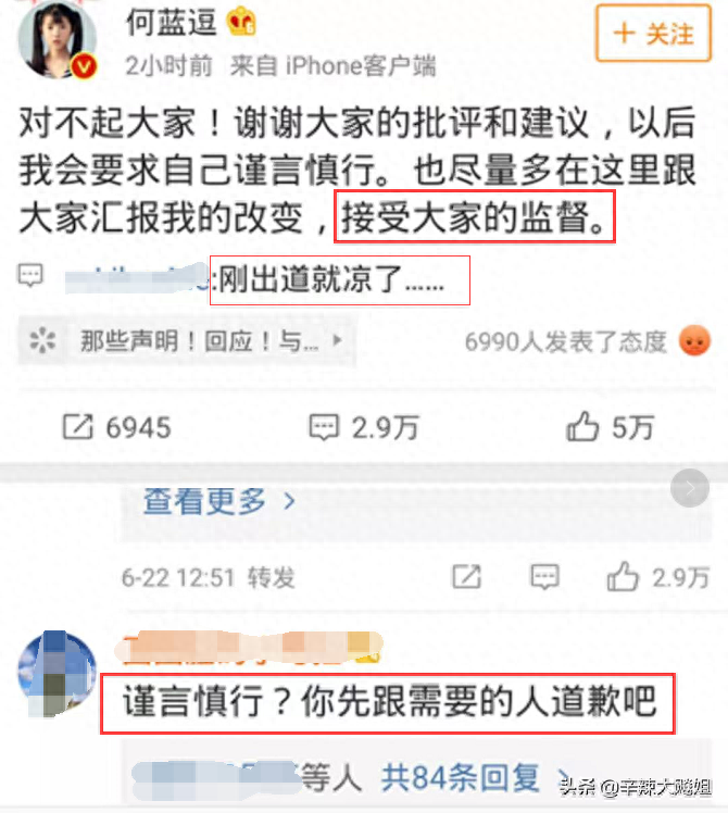 不过何蓝逗可能意识到话题的严重性,马上出来道歉了,但是也并没有承认自己到底什么地方做错了,只说接受批评和建议,并接受大家的监督,网友质疑:何蓝逗如今的道歉诚意似乎并没有那么足,只是对不起就完事,还希望大家监督自己,而评论下也都是不接受何蓝逗道歉的言论,大家认为何蓝逗没有和当事人道歉,所以何蓝逗并没有真正认清自己的错误。