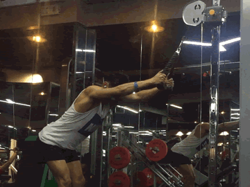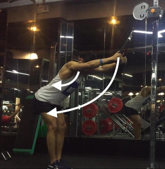 俯身的直臂下拉,算是增加了运动幅度!背阔肌被往上方与前方拉伸!